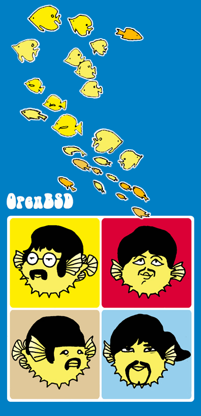 Every 6 months the OpenBSD project has the pleasure to release our software with artwork and a matching song. Theo and some other developers mutate a theme (from a classical setting, a movie, or some genre) into the fishy world of Puffy, to describe some advance, event or controversy the project went through over the previous six months. To match the art released with the historical CD sets, we joined up with some musicians we know to make at least one song.